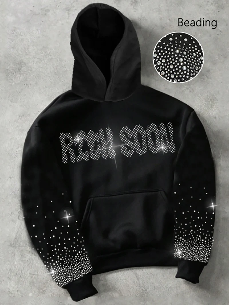 Men's Y2k Trendy Rhinestone "RICH SOON" Black Hoodie